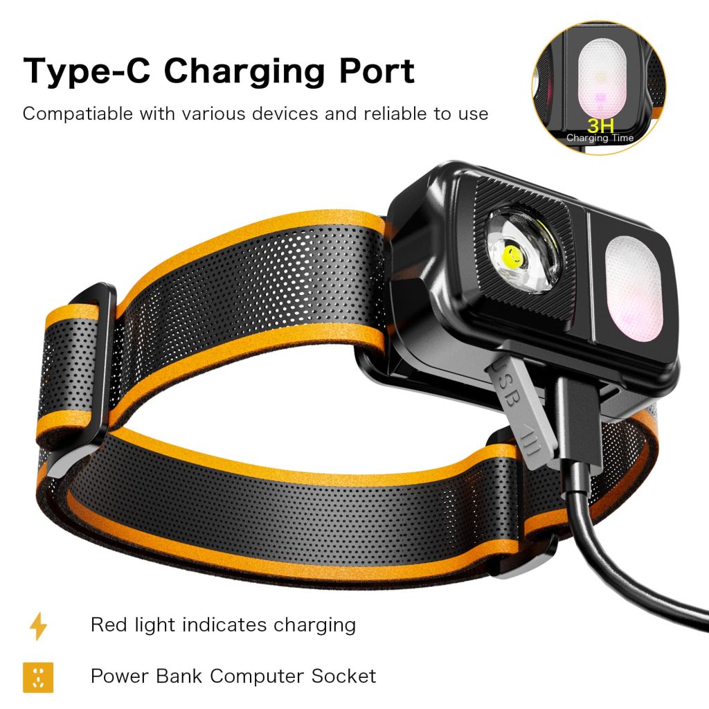 (5)Efficient Power & Charging: Powered by a built-in 703040/920mAh battery, the headlamp features a USB-C charging port covered with a rubber seal. This prevents dust and water ingress, helping to maintain a high level of waterproof protection.