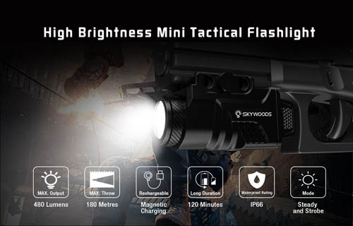 1) The high-quality led chip in this tactical light supports brightness up to 480 lumens with a beam distance of 180m.
