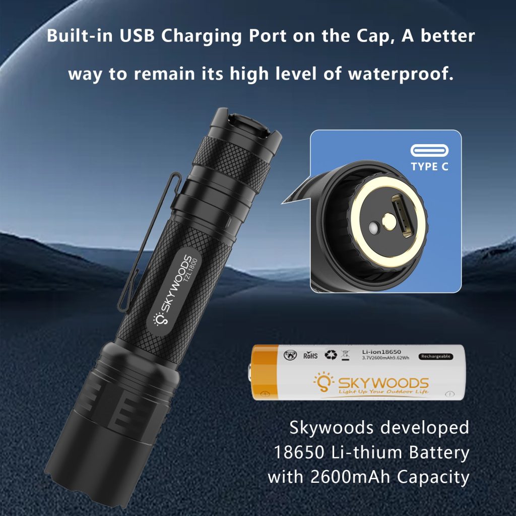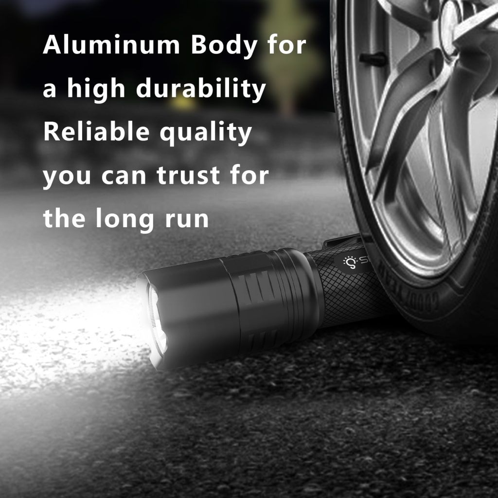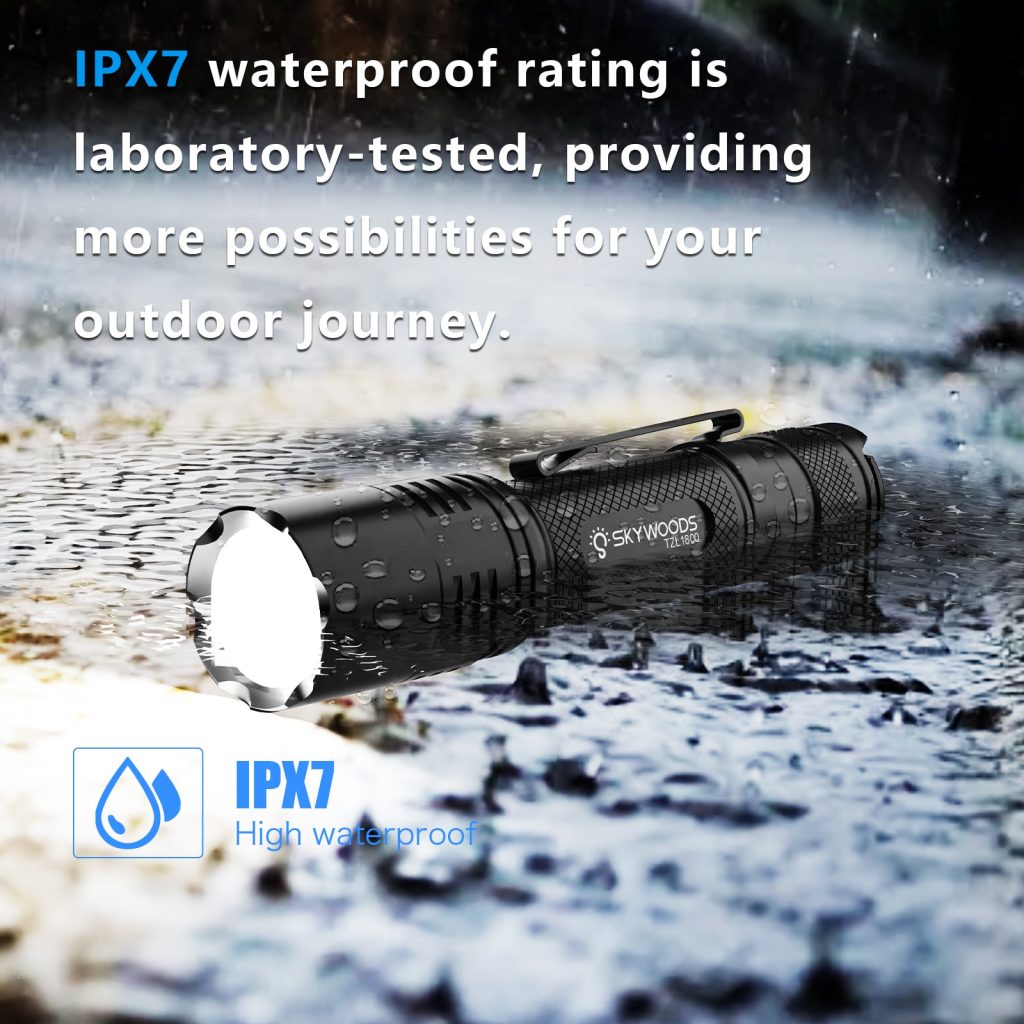 3)Material: Made of aircraft-grade aluminum alloy for durability and strength. With an IPX7 waterproof rating and high-quality materials, this outdoor flashlight is designed to prevent water from penetrating through any gaps