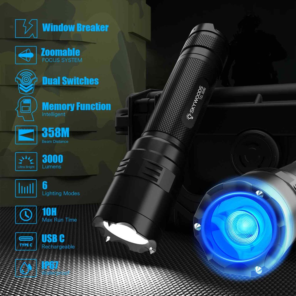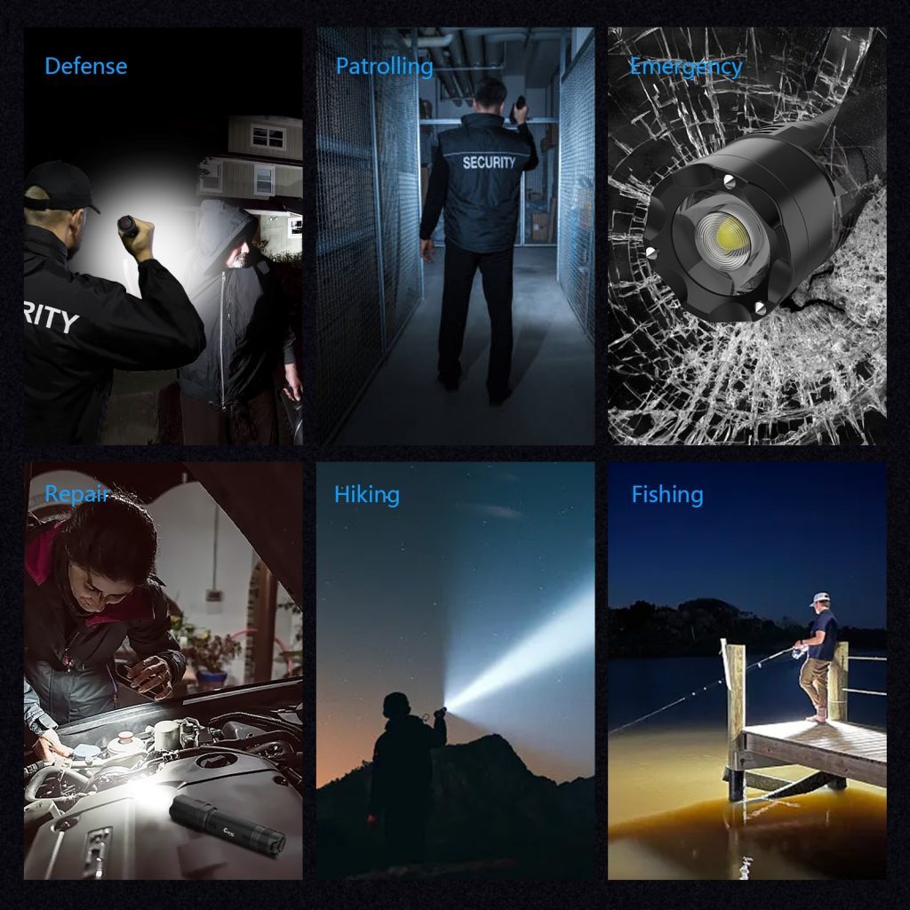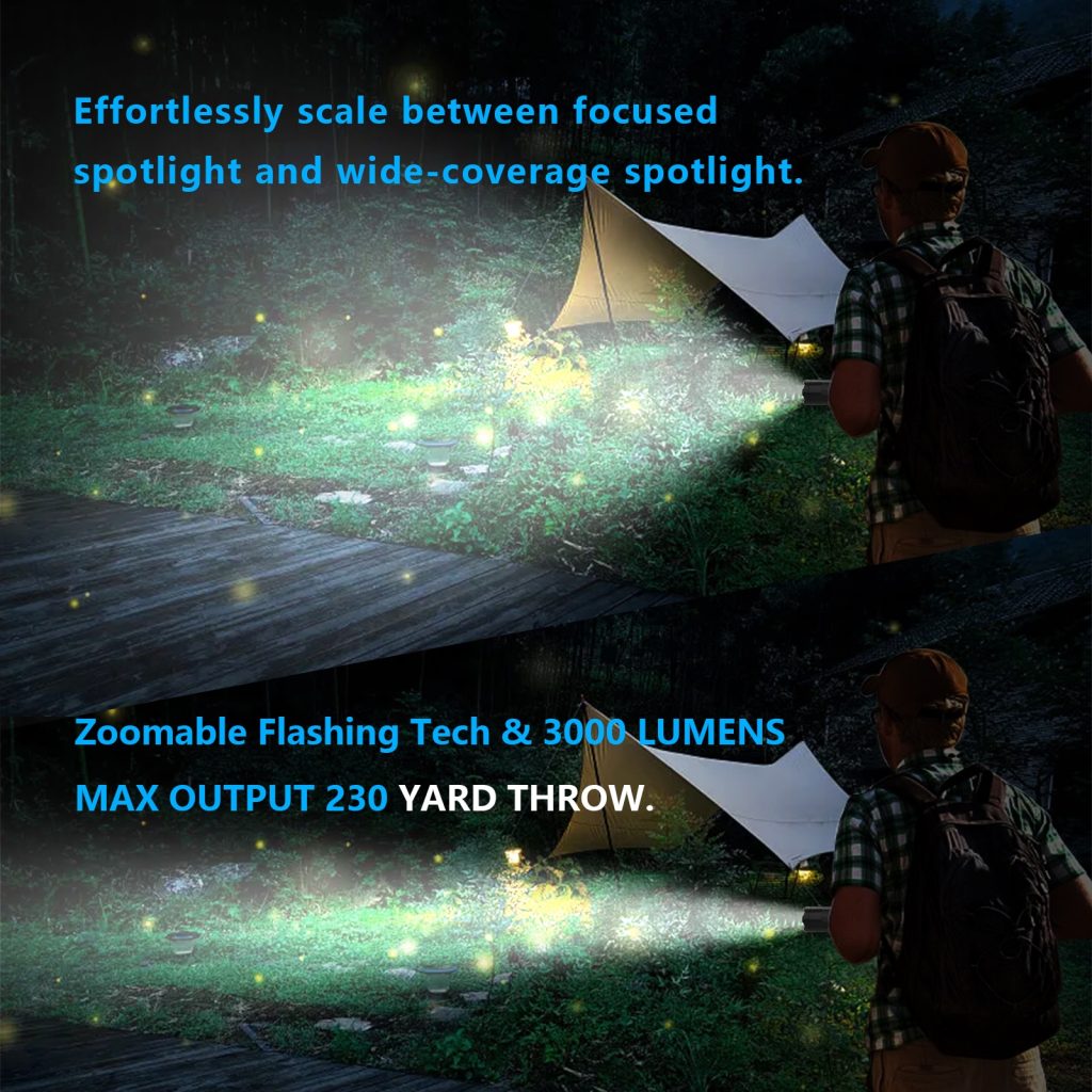 Material: Made of aircraft-grade aluminum alloy for durability and strength. With an IPX7 waterproof rating and high-quality materials, this outdoor flashlight is designed to prevent water from penetrating through any gaps